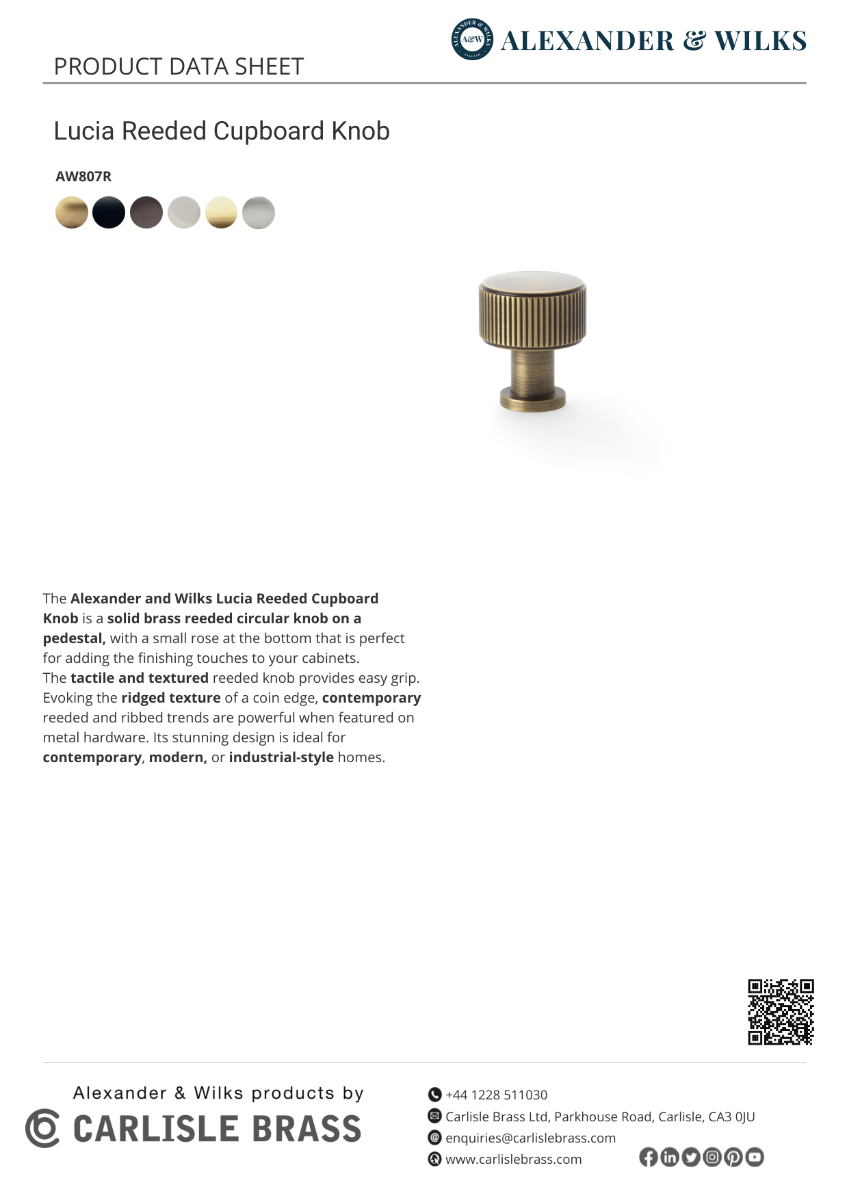 The Alexander and Wilks Lucia Reeded Cupboard Knob is a reeded circular knob on a pedestal, with a small rose at the bottom, created from solid brass. Finished in Antique Brass, Dark Bronze PVD, Polished Nickel, Satin Brass PVD, and Satin Nickel Knob diameters of 29mm or 35mm. Alexander & Wilks represents the very best of architectural hardware and ironmongery.