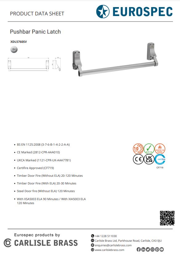 CARLISLE BRASS – XDL5760SV PUSHBAR PANIC LATCH WITH DOGGING FUNCTION C/W STRIKE