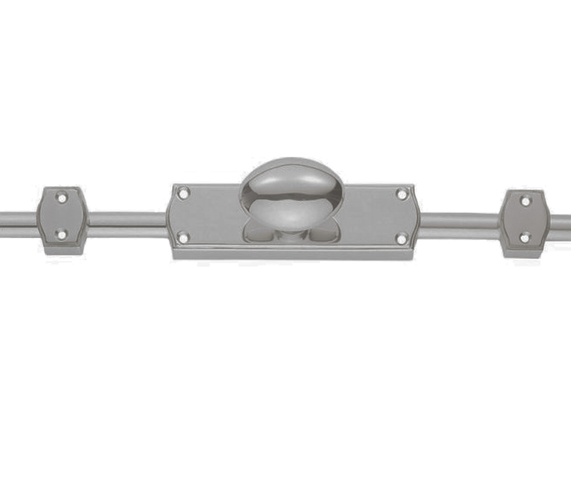 Oval knob style handle espagnolette bolt used for securing a door top and bottom by simply turning the handle. They are used on French doors and have a strong visual presence being surface mounted and provide additional security