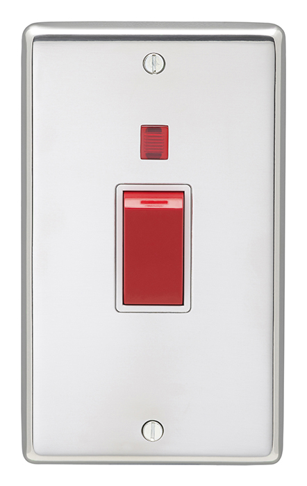 Eurolite Pss45Aswnw 45Amp Dp Cooker Switch With Neon Double Round Edge Polished Stainless Steel Plate Red Rocker White Trim