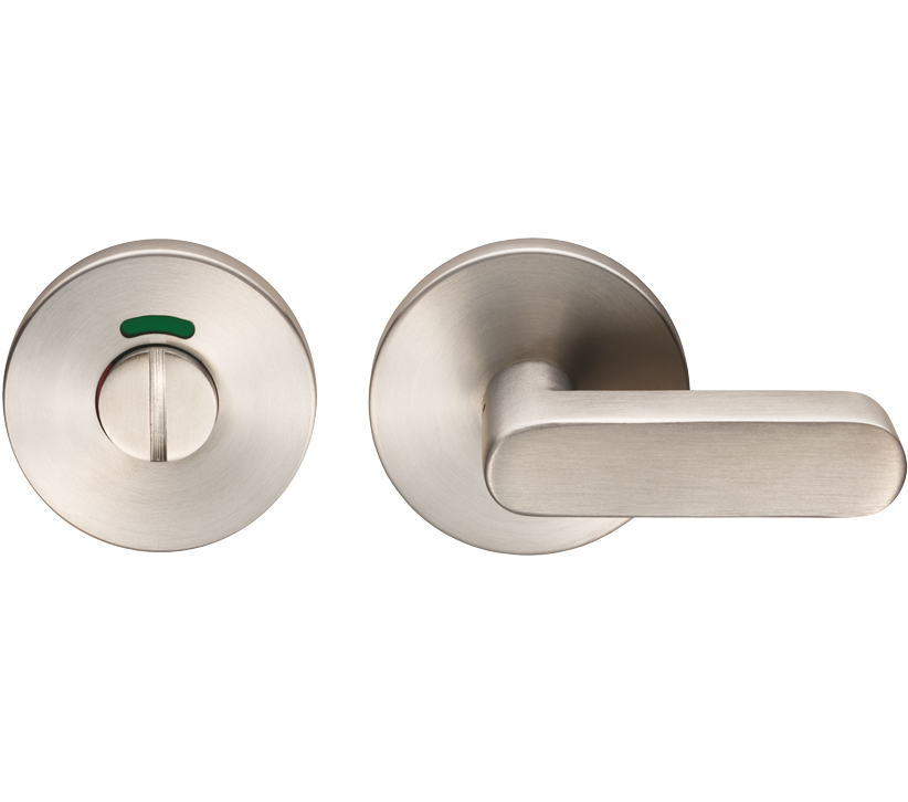 Bathroom turn and release with indicator on a concealed fix slim round rose. Grade 201 rose inner. A modern style large flat elongated oval shaped turn with a coin release on the other side in case of emergency access and a coloured segment to signal if engaged or vacant