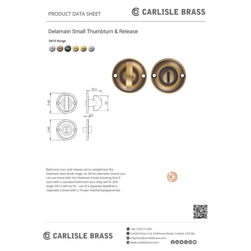 Bathroom turn and release set to compliment the Delamain door knob range. Its 42mm diameter means you can use these with the Delamain Knobs knowing that if used with a standard bathroom lock, they will fit. (the larger DK12 will not fit – use of a separate deadbolt is required) .Comes with a 10 year mechanical guarantee.