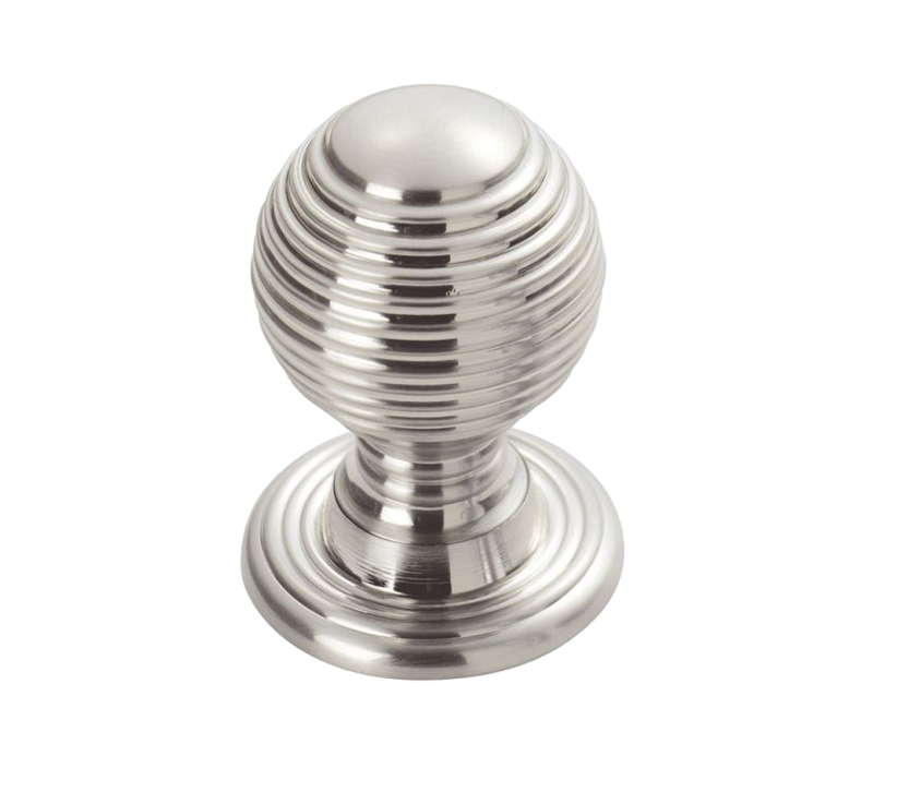 A round metal reeded ball knob on a matching ringed round rose and stem. A traditional style which will also compliment modernistic settings. Very easy to grasp and provides a comfortable feel and good torque when opening doors and drawers