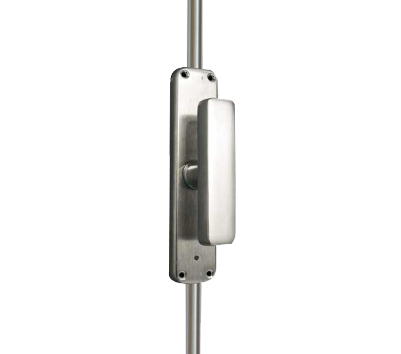 Square style handle espagnolette bolt used for securing a door top and bottom by simply turning the handle. They are used on French doors and have a strong visual presence being surface mounted and provide additional security
