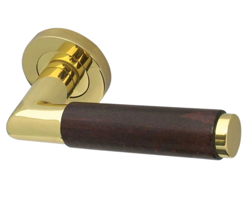 Frelan Hardware Reguitti Cuba Dark Wood Door Handles On Round Rose, Polished Brass(Sold In Pairs)