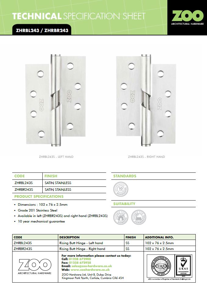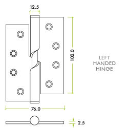 Our right handed rising butt hinges are for use on doors that, when standing with the door opening away from you, the hinges are on the right hand side.