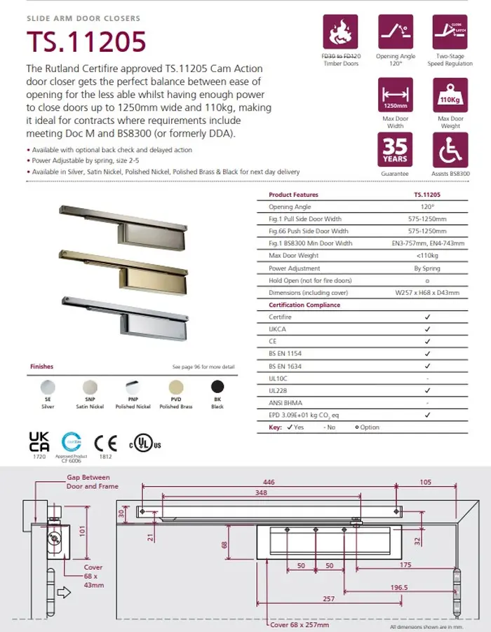 - Variable power adjustable EN1154 size 2 to 5 – does doors up to 110kg & 1250mm wide