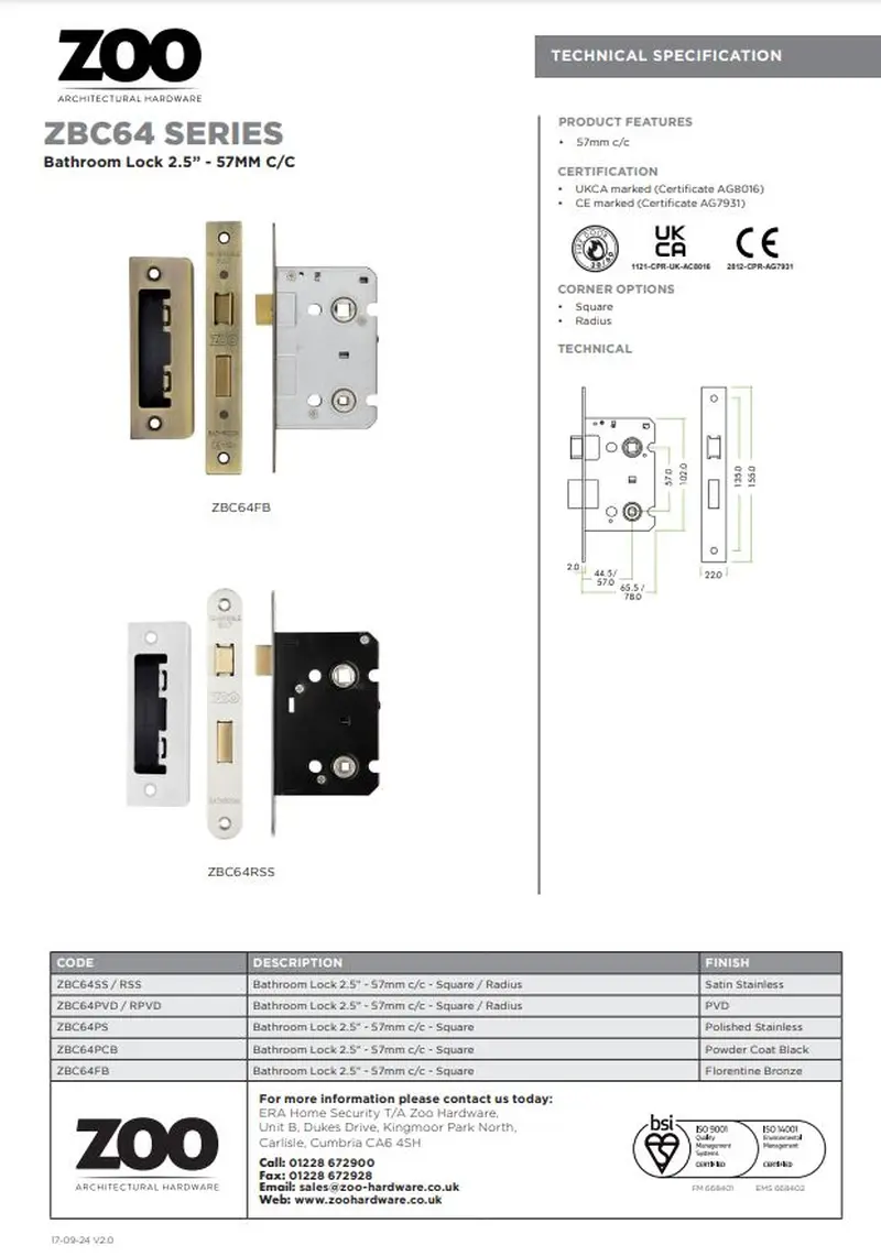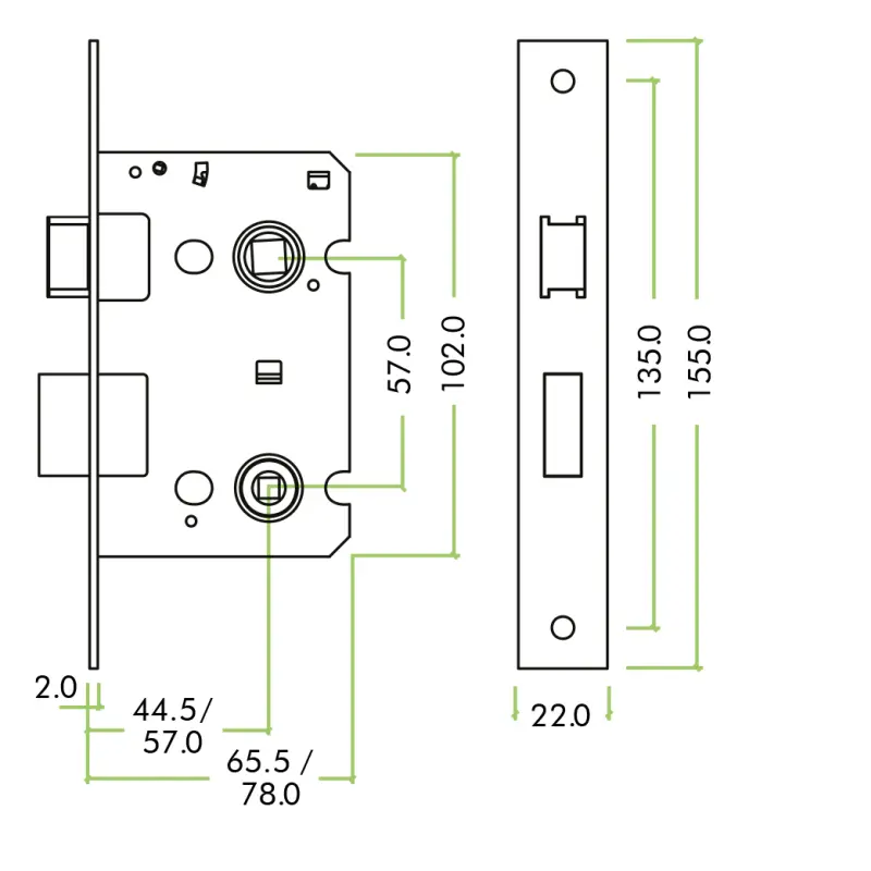 - Specially designed for bathroom doors, with the latch operated by the handle or knob, and the lock operated by a Turn & Release with a 5mm spindle