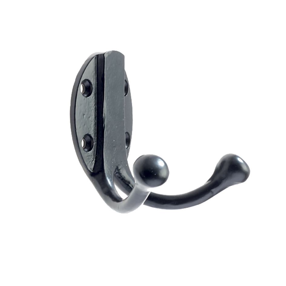 - A simple and traditional black antique double robe hook on a face-fix round plate for quick and easy fixing