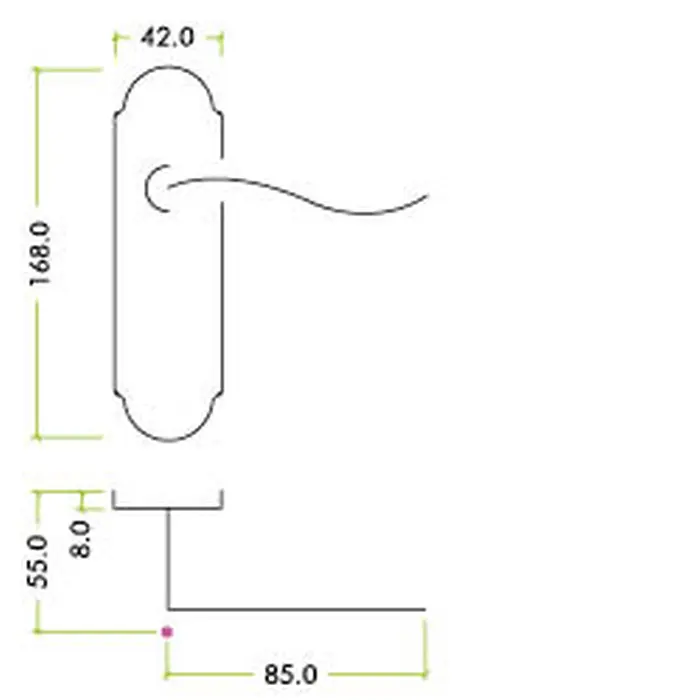 - Dimensions: 168mm x 42mm Backplate, 85mm Lever Length, 55mm Projection