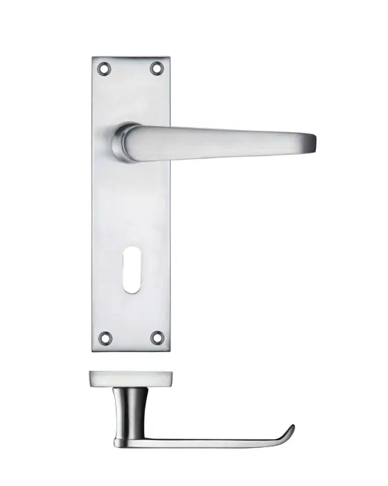 - This Project Door Handle has a classic curved shaped backplate with two visible screw fixings at each end of the plate and a straight, flat lever