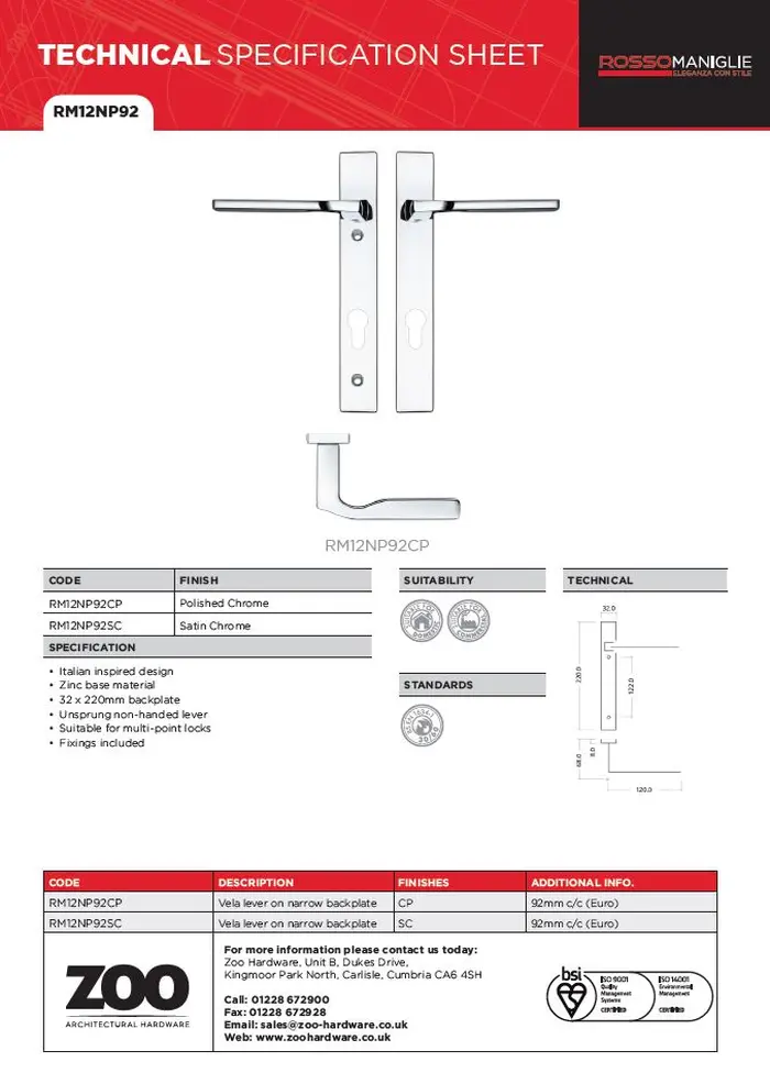 Zoo Hardware Rosso Maniglie Vela Euro Lock Multi Point Door Handles On Narrow 220Mm Backplate, Satin Chrome (Sold In Pairs)