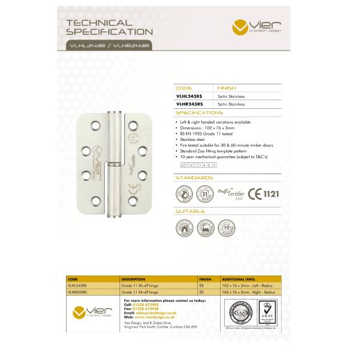 Zoo Hardware VLHR243RS Grade 11 Lift Off Hinge Stainless Steel – Radius – Grade 201 – 102 x 76 x 3mm – Right Hand Satin Stainless
