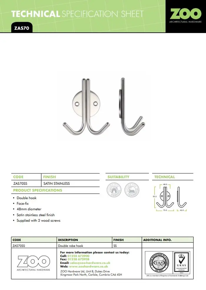 Zoo Hardware Zas Double Robe Hook, Satin Stainless Steel