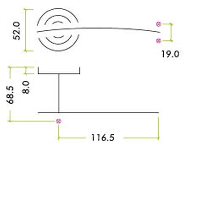 - Dimensions: 52mm x 8mm Push On Rose, Lever Length 116.5mm, Projection 68.5mm