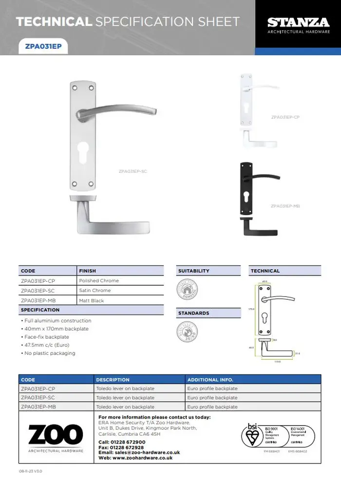 Zoo Hardware ZPA031EP-CP Toledo Door Handle on Euro Backplate Polished Chrome