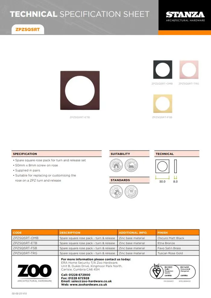 Zoo Hardware ZPZSQSRT-FSB ZPZ Spare Square Rose Pack To Suit Turn & Release & Esc Pvd Satin Brass